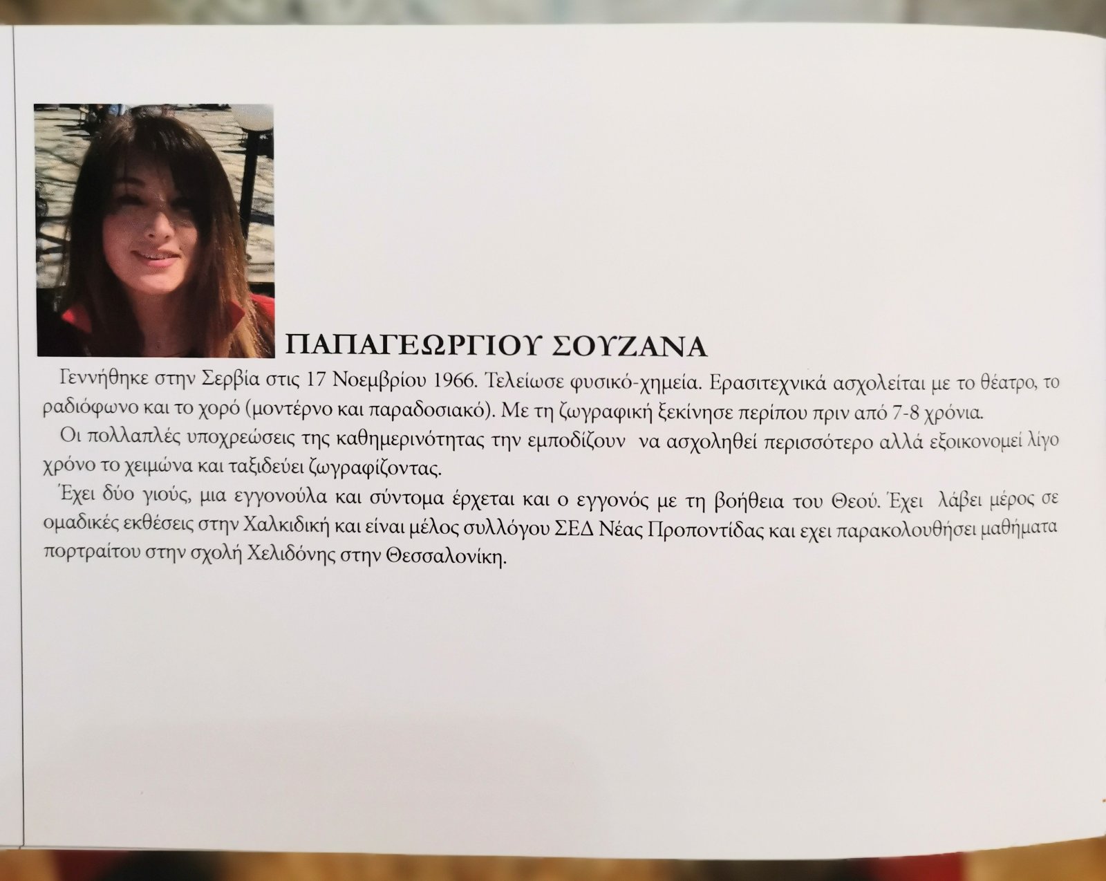 She has two sons (Stephanos and Marcos), a granddaughter (Melina), and two grandsons (Matey and Mijat). She has participated in group exhibitions in Chalkidiki and is a member of the association SED of New Propontida. She took portrait classes at Helidonis Art School in Thessaloniki.